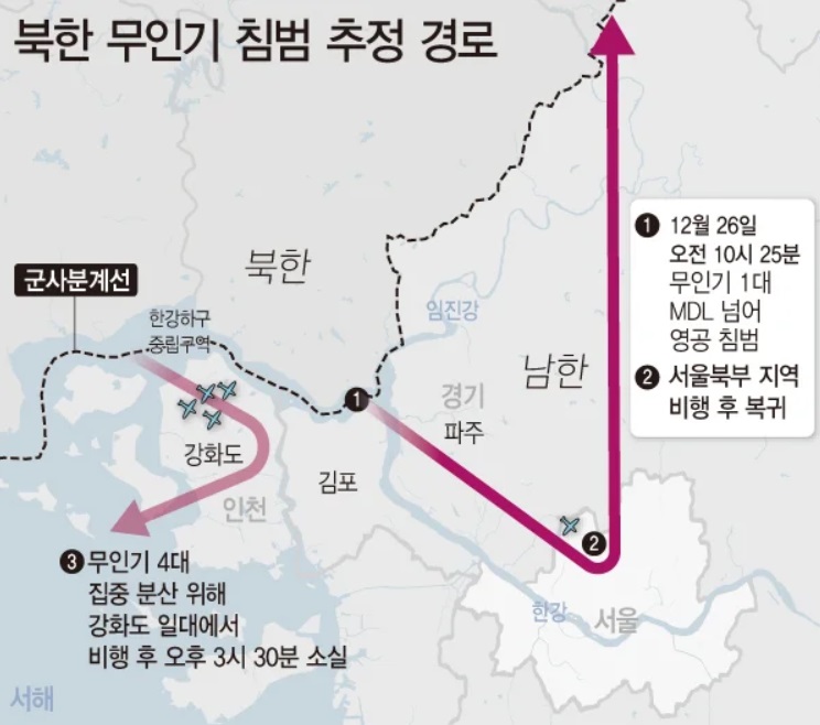 우리 군의 합동참모본부에 따르면 12월 26일 오전 10시 25분부터 군사분계선(MDL)을 넘어 김포시, 파주시를 포함한 경기도 일대와 강화도 인근에 북한의 무인기 수 대가 발견되었다고 한다. 2017년 성주의 사드기지에 북한 무인기가 침범했던 사건 이후 5년여 만에 처음으로 확인된 북한 무인기 도발이다.