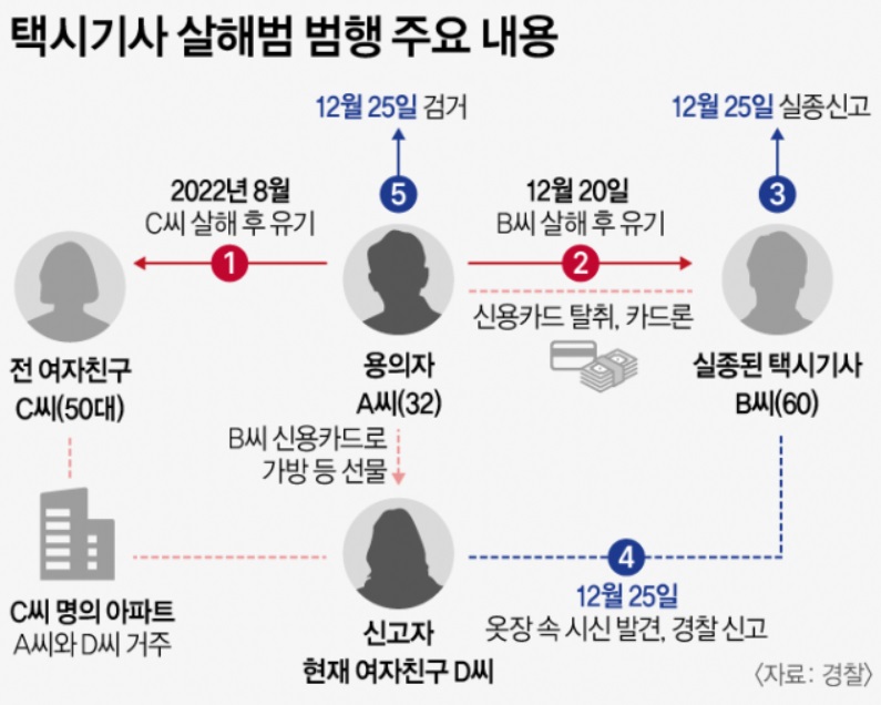 앞서 이 씨는 택시 기사를 살해한 집의 주인이자 전 여자친구였던 50대 여성을 지난 8월 7-8일쯤 살해하고 시신을 파주시 공릉천변에 유기한 혐의도 받는다. 아직 이 여성의 시신은 발견되지 않았으며, 수색 작업은 계속 진행 중이다. 또한 더 파렴치한 사실은 전 여친을 살해 후 "큰 돈을 상속받았다"며 주변 지인들에게 자랑까지 하였다.